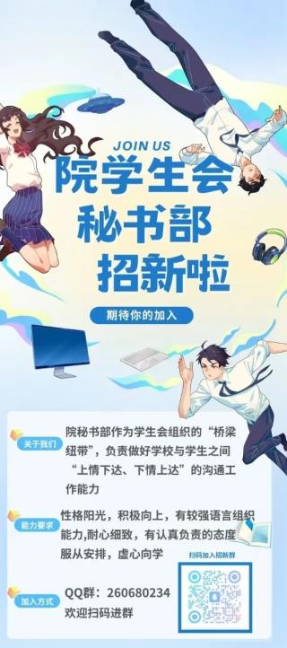 院秘书部是整个学生会组织中不可或缺的关键部门,它宛如学生会的”中枢神经系统“,在幕后默默发挥着至关重要的作用。我们注重部门成员的能力提升和团队建设,不定期开展培训活动,加入我们,你将获得能力的全面提升,快来开启你的校园精彩章!