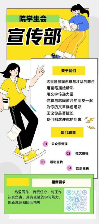 这里是创意与才华的汇聚地。宣传部成员们用灵动的文字、精美的海报和吸引人的视频,将学生会的活动信息传递给每一位同学。每当学校有重大活动时,必少不了宣传部的参与,前期预热,现场拍摄,后期推送。同学们可以通过“青春工贸”,来了解学校的大小事,在宣传部,我们把平淡的信息变成夺目的焦点,将无声的故事记录在册,在这里,你能学习文章排版,文案撰写。加入我们,和我们一起,用文字的力量让校园宣传充满温度。