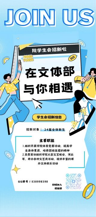 院文体部,是活力与激情的汇集地,在这里,你能策划一场场令人瞩目的文艺演出,让艺术之花盛放,也能组织一场场酣畅淋漓的体育赛事,让青春活力肆意。如果你有想法,不要犹豫,请加入我们,让我们在校园生活中,创造独属于我们的青春记忆!