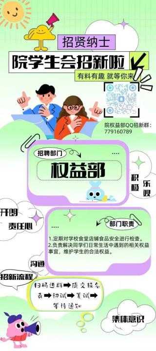 权益部,是同学们权益的守护者,我们是校园里的维权卫士,认真倾听每一位同学的声音,无论是宿舍还是食堂。我们积极与学校各部门沟通、协调、反馈并解决,为大家争取更好的学习环境和生活条件,如果你心怀正义,想要为同学们的权益出一份力,那快来加入我们吧!让我们携手共进,开启一段有意义的旅程。