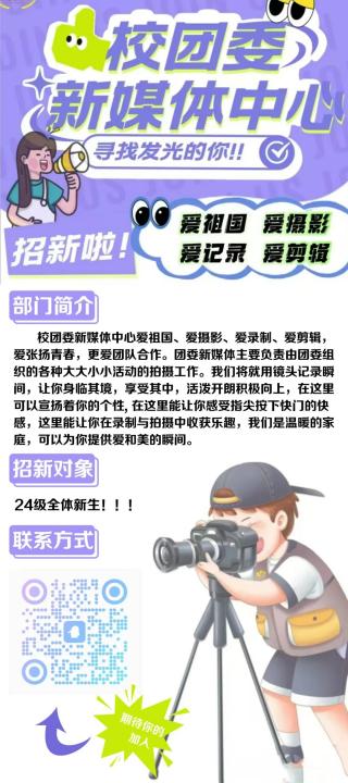 你是否对新媒体的世界充满好奇与向往?新媒体中心就是你发挥的舞台。我们是校园信息的传播者,我们紧跟潮流,用创意和才华吸引目光,用独特视角记录校园点滴,让分校区和更多的人了解学院的日常工作,如果你热爱新媒体,有想法,有激情,那就快快报名吧!