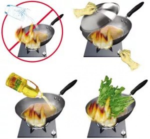 (四)油锅起火不能用水扑救,关闭阀门,盖上锅盖或用湿布覆盖,还可以放入切好的蔬菜。