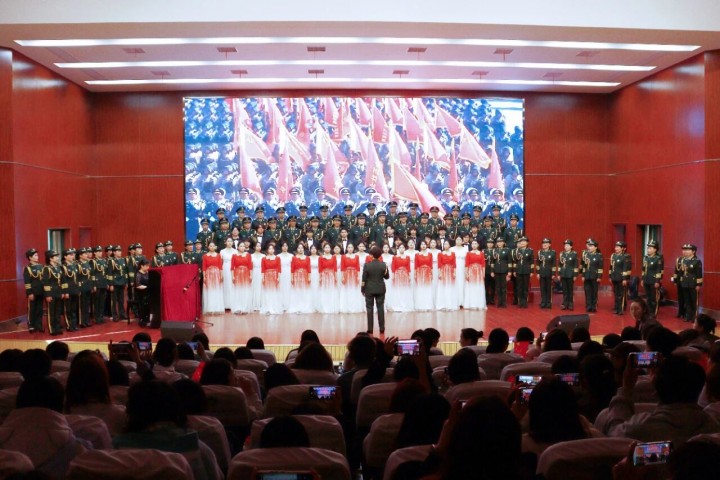 演出在《中国人民解放军军歌》激昂的旋律中拉开帷幕,铿锵有力的节奏瞬间点燃现场氛围;《军旗升起的地方》用歌声回溯革命起点,深深唤起师生对英雄城南昌的红色情怀;《十送红军》《娄山关》等曲目以婉转与豪迈交织的演唱,生动重现长征路上的军民鱼水情与革命壮志豪情;男四重唱《游击队之歌》《弹起我心爱的土琵琶》凭借灵动和声,传递出抗战军民乐观向上的精神风貌与坚毅不屈的斗争意志;《太行山上新篇》《绒花》《绣红旗》等作品,或深情致敬革命先辈,或真挚诉说信仰纯粹,让观众沉浸在深沉的红色情感之中;最后,《我是一个兵》《中国人民志愿军军歌》《强军战歌》以磅礴恢弘的气势收尾,将现场气氛推向最高潮,全场掌声经久不息。