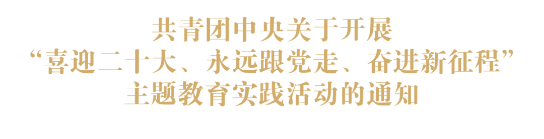 今年,我们党将召开第二十次全国代表大会,这是包括广大青少年在内的全党全国各族人民政治生活中的一件大事。迎接和学习宣传贯彻党的二十大,是贯穿全年的工作主线。今年也是中国共青团成立100周年,团结引领广大青少年坚定跟党走、建功新时代是对共青团成立100周年的最好庆祝。共青团中央决定,在全团部署开展“喜迎二十大、永远跟党走、奋进新征程”主题教育实践活动。