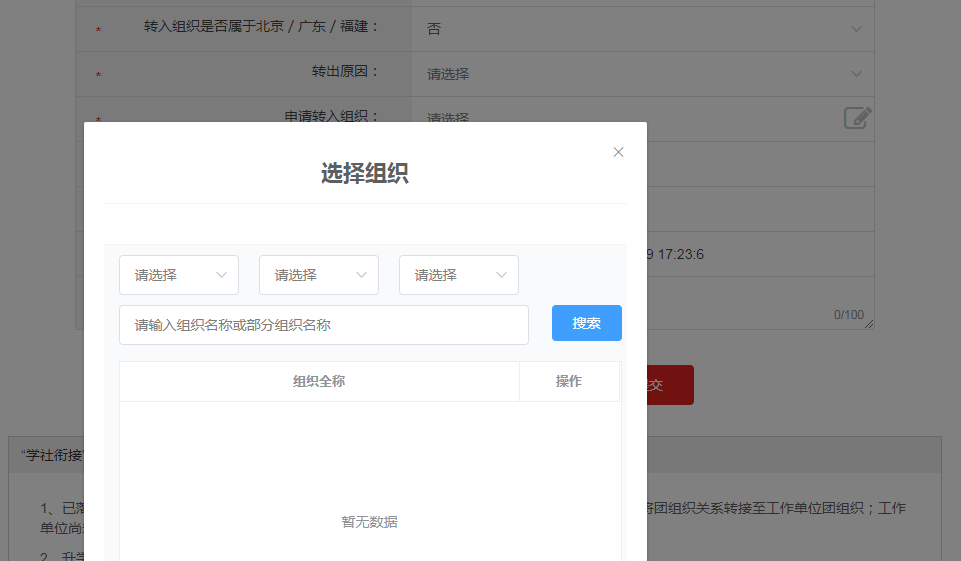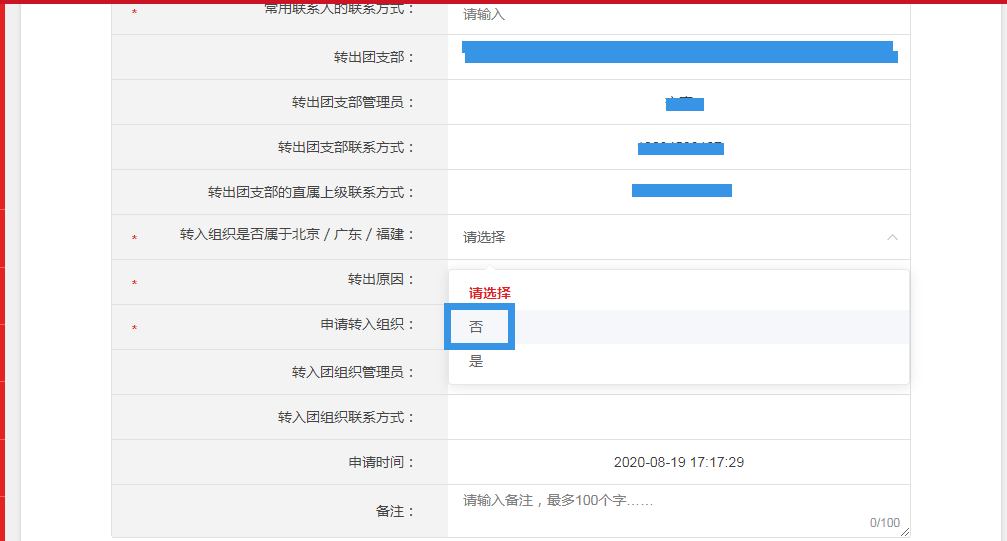 第三步:点击“转入组织是否属于北京/广东/福建”处根据学校所在地进行选择