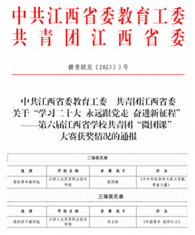 日前,省委教育工委、团省委发布第六届江西省学校共青团“微团课”大赛获奖名单,学院2件作品分获高校青年教师组二等奖和高校团干组三等奖。