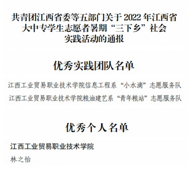 12月9日,省委宣传部、省文明办、省教育厅、团省委、省学联联合下发通知,表彰2022年年江西省大中专学生志愿者暑期“三下乡”社会实践活动先进集体和个人。学院粮油·建艺系“青年粮站”志愿服务队和信息工程系“小水滴”志愿服务队获评全省优秀实践团队,旅游商务系林之怡同学获评全省优秀个人。今年8月,学院信息工程系“小水滴”志愿服务队从全国3000多支队伍中脱颖而出,入选全国大中专学生暑期社会实践志愿服务队。