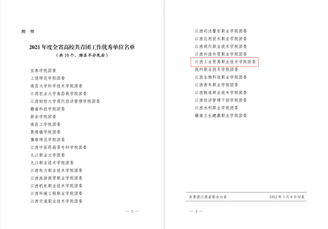 近日,共青团江西省委印发了《关于2021年度全省共青团工作评议情况的通报》,江西工业贸易职业技术学院团委荣获“2021年度全省共青团工作优秀单位”称号,学院连续六年获此殊荣。