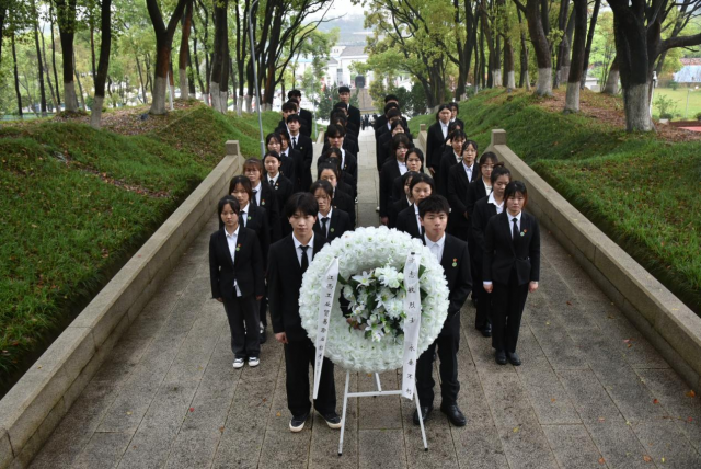 团学干部们缓慢地走上台阶,向烈士送上花圈,肃立、默哀,以示对先烈的哀思和缅怀。