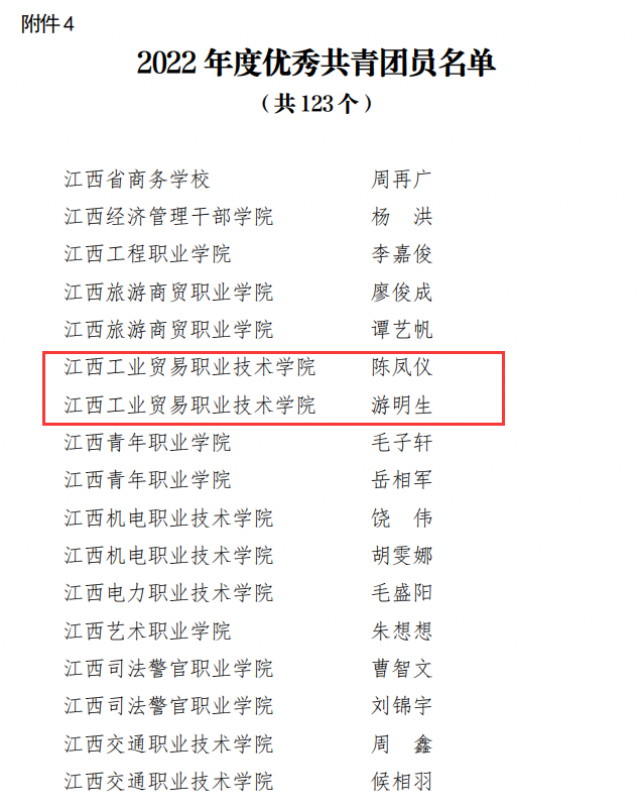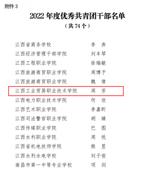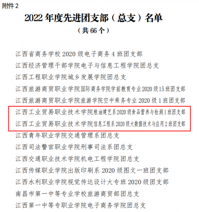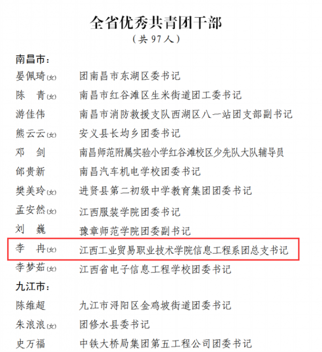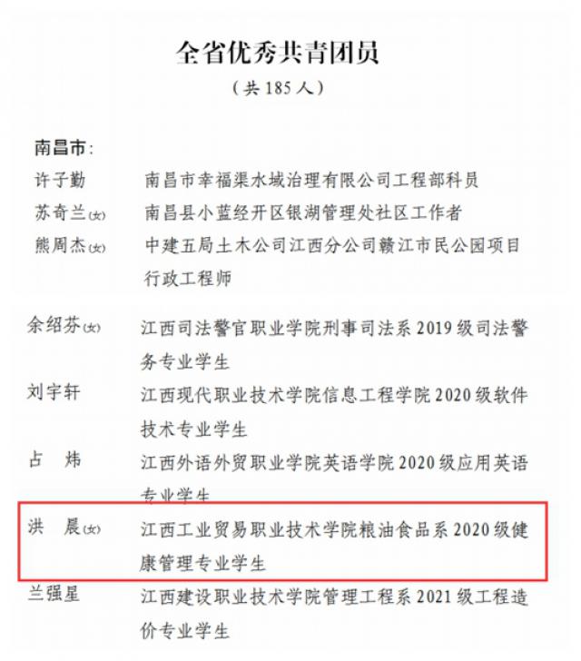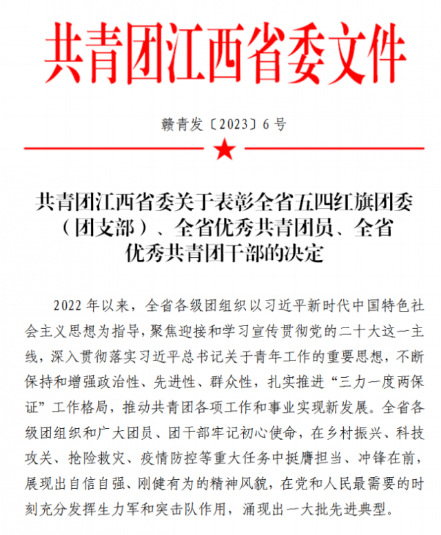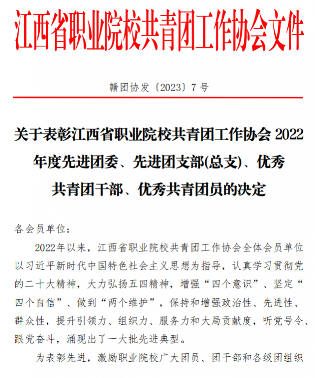 近日,共青团江西省委和江西省职业院校共青团工作协会分别下发文件,对在2022年共青团工作中表现优秀的组织和个人给予表彰。学院信息工程系团总支书记李冉获全省优秀共青团干部称号,粮油建艺系2020 级健康管理专业洪晨同学获全省优秀共青团员称号;粮油建艺系2020 级食品营养与检测 1 班团支部、信息工程系 2020 级大数据技术与应用 2班团支部获评江西省职业院校共青团工作协会先进团支部(总支)称号,经济贸易系团总支书记周芳获评江西省职业院校共青团工作协会优秀共青团干部,机电工程系游明生同学、旅游商务系陈凤仪同学获评江西省职业院校共青团工作协会优秀共青团员。