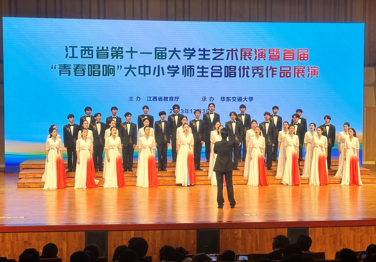 12月1日由江西省教育厅主办,华东交通大学承办的第十一届大学生艺术展演活动正式开幕,院合唱团谢林溪老师指导、黄洋老师伴奏的作品《敕勒歌》、《不要怕》从全省数十所参赛高校中脱颖而出,作为全省前十(高职前三)参加线下展演,此次展演由团委书记陈永乐老师、罗慧敏老师、王菲老师带队,院合唱团不负众望,在展演中表现优异,作为唯一一所高职院校入选大艺展开幕式音乐会。