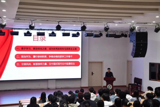 甘小平部长以《中华民族伟大复兴路上的青年担当》为题,从“善于学习,奠定担当之基,成为优秀的青年马克思主义者”“担当作为,履行使命职责,争做合格的团学工作骨干”“引领风尚,彰显榜样力量,在中国式现代化中挺膺担当”等三个方向深入剖析了青年在中华民族伟大复兴进程中应有的责任与担当,强调青年是实现民族复兴的重要力量,激励广大团学骨干在发挥学院立德树人作用、服务学院党政中心大局、帮助广大学生成长成才中发挥更大作用,让每一名走出校园的同学都能成为有理想、敢担当、能吃苦、肯奋斗的新时代好青年。