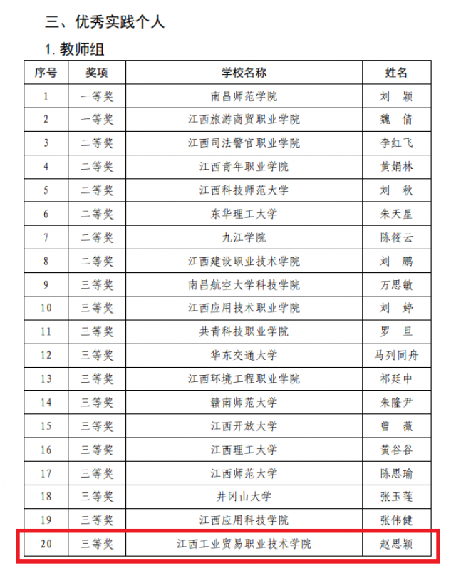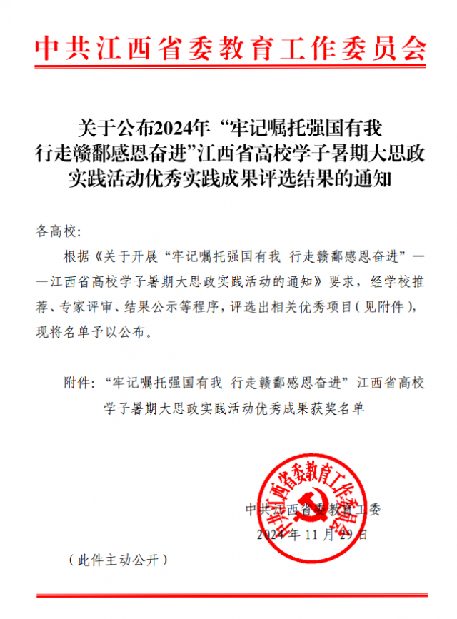 近日,中共江西省委教育工委公布了“牢记嘱托强国有我 行走赣鄱感恩奋进”江西省高校学子暑期大思政实践活动优秀实践成果评选结果,江西工业贸易职业技术学院荣获“优秀组织单位”,学院机电工程系选送作品《一件羊皮袄》荣获优秀新媒体作品一等奖,学院粮油·建艺系赵思颖荣获优秀实践个人教师组三等奖。