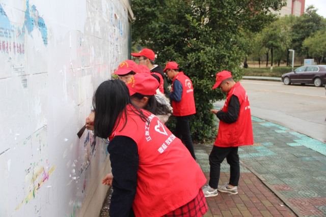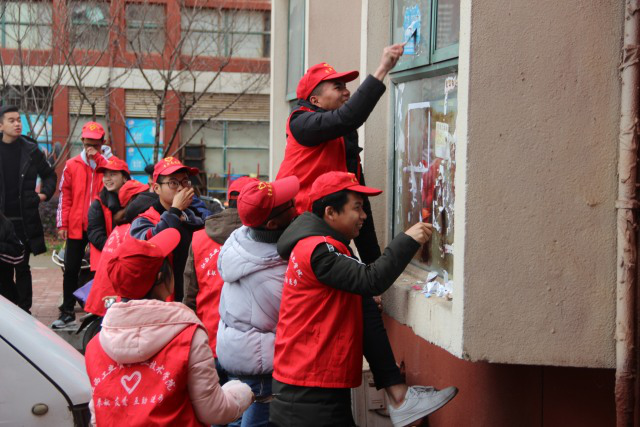 院青年志愿者开展的“清理校园牛皮癣”活动,大家用着自己的休息时间,认真清理校园各处的小广告。
