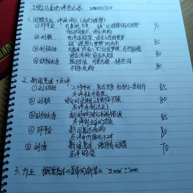 主持基地每周一、周四晚进行线上教学,目前课程以即兴评述为主,配音游戏为辅。课程中老师会随机选取热点话题,让同学们进行思考和评述,锻炼主持人的快速思维和即兴能力。
