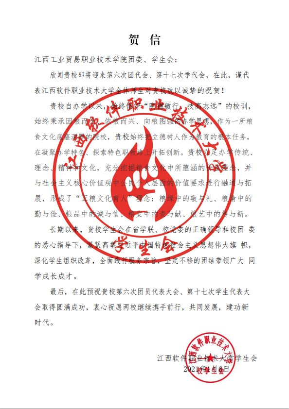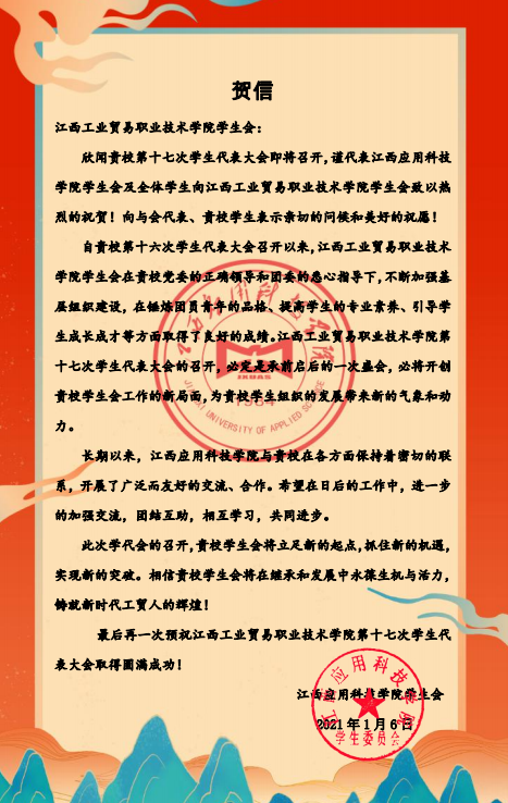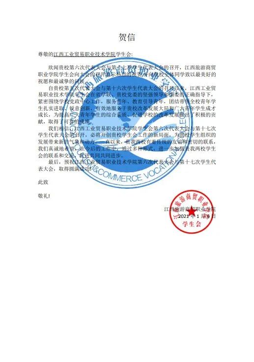 同时,我们还得到了各兄弟院校和社会各界的大力支持!收到了来自江西豫章师范学院、江西应用科技学院、南昌职业大学、江西软件职业技术大学、江西外语外贸职业学院、江西旅游商贸职业学院、江西经济管理干部学院、江西青年职业技术学院、江西工程职业学院、南昌工学院、江西省商务学校等高校的贺信。