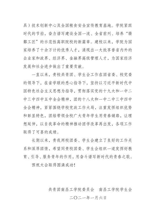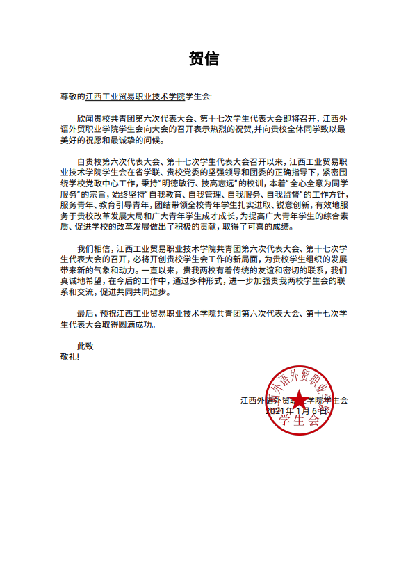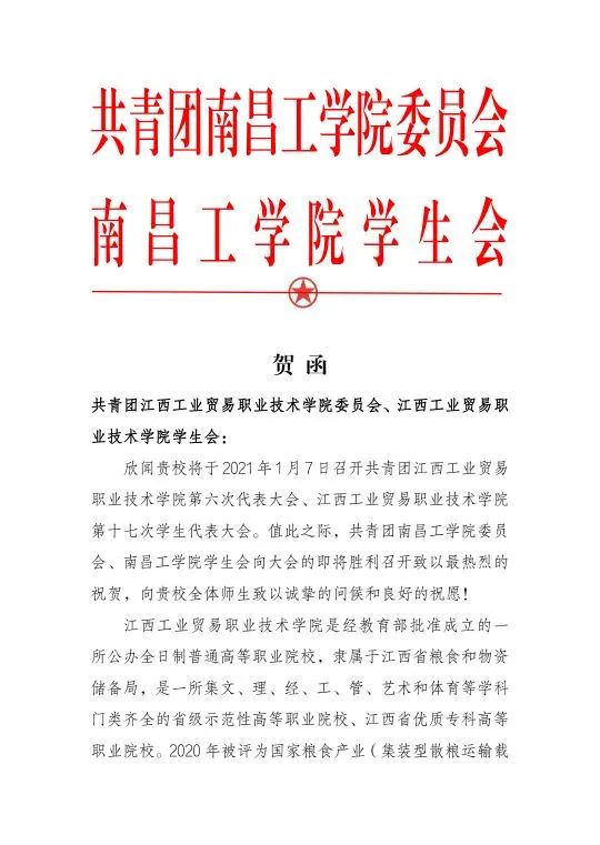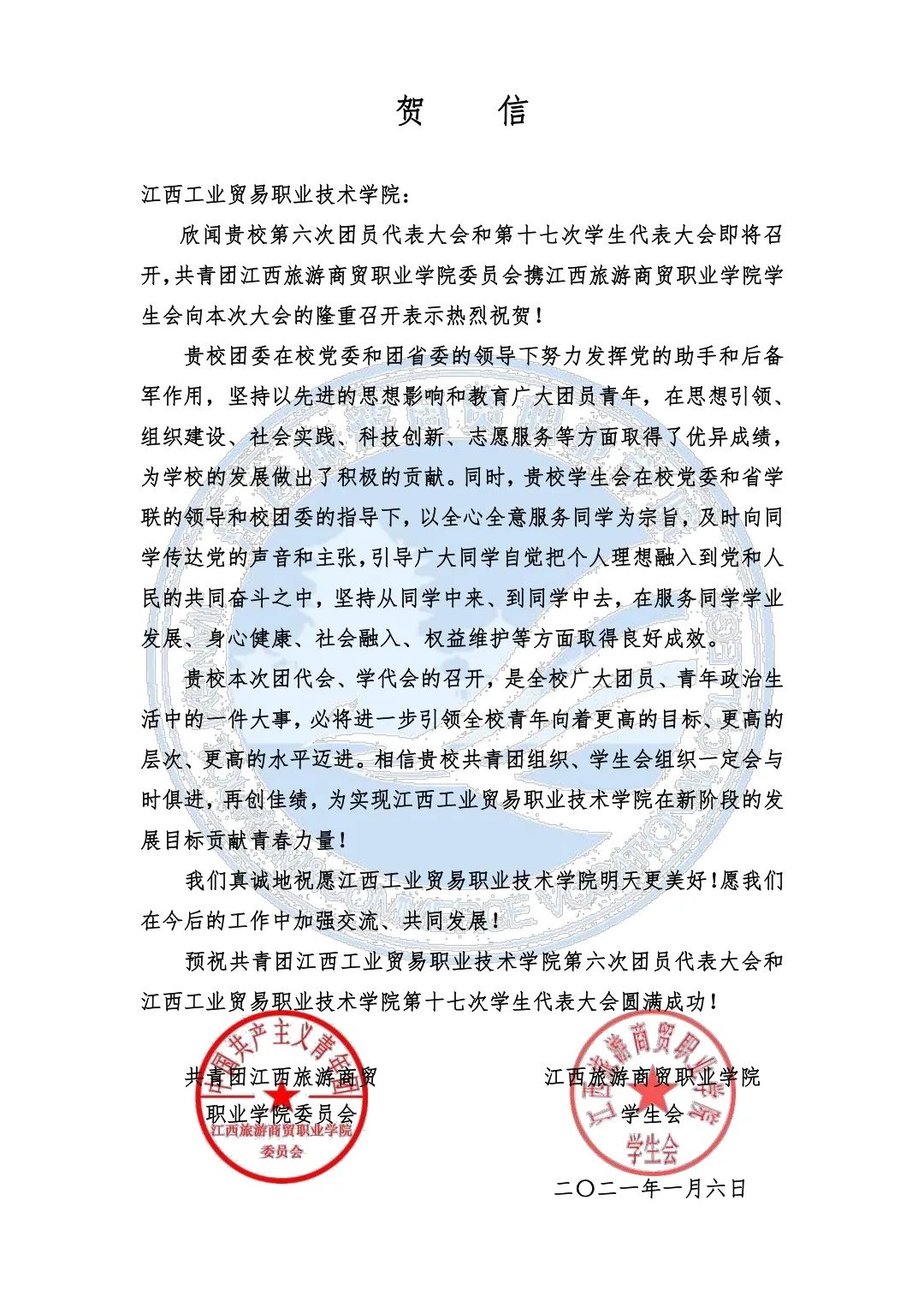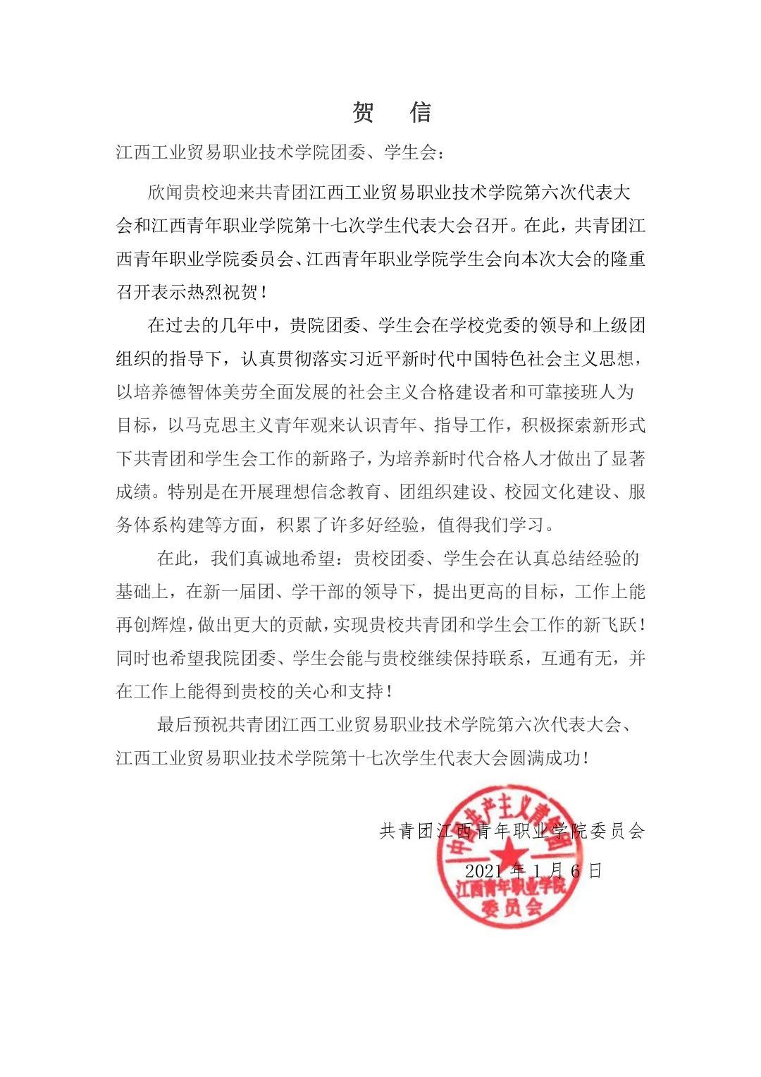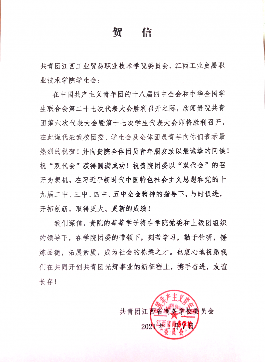 希望新一届团委会和学生会在团省委、局机关党委、学院党委的领导下,省学联具体指导下,不忘初心,牢记使命,团结带领广大工贸学子团结协作,与时俱进,开拓创新,履职尽责,继承发扬全心全意为学生服务的优良传统,在思想引领、权益维护、校园文化、组织建设、学生成长服务等各方面做出更大的成绩,为学院“双高”建设发展作出积极贡献。