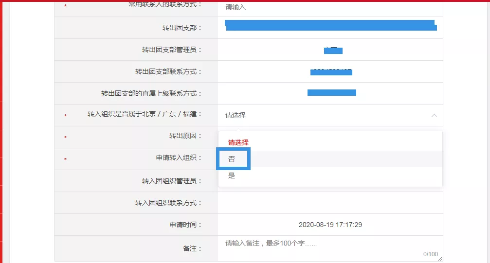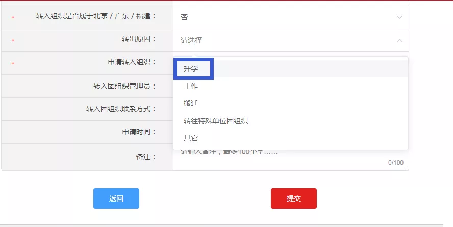 第三步:点击“转入组织是否属于北京/广东/福建”处根据学校所在地进行选择