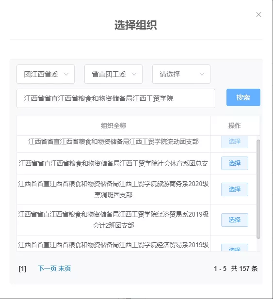 第六步:选择“团江西省委”“省直团工委”,在搜索栏搜江西省省直江西省粮食和物资储备局江西工贸学院,再根据所在班级选择团支部。
