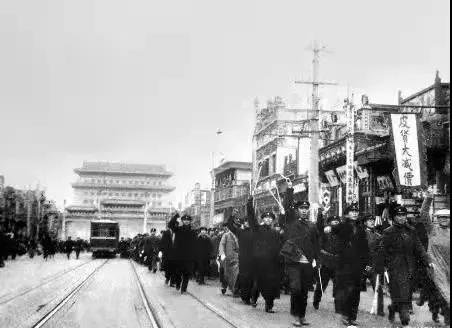 12月9日上午10时30分,北平各大中学校的爱国学生6000余人涌上街头,奔向新华门,向国民政府军政部长何应钦请愿。愤怒的学生振臂高呼:“打倒日本帝国主义!” “反对华北五省自治!”“打倒汉奸卖国贼!”“立即停止内战!”
