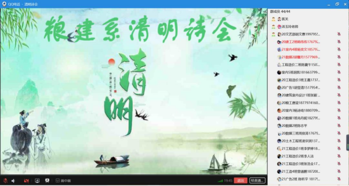 粮油建艺系于线上组织清明诗会主题活动和书签绘画主题活动以诗歌诵读、书签绘画作品为载体,表达了对革命先辈的无比怀念之情,更以清明为契机,立志把强大中华民族的重任接过来,传下去,让新中国走向更加辉煌灿烂的春天。