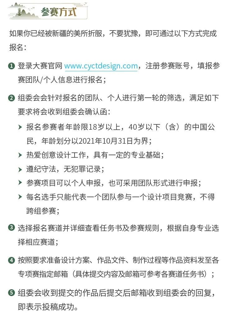 创青春·中国青年文化旅游创意设计大赛(文化润疆专项)由共青团中央青年发展部、文化和旅游部产业发展司、新疆自治区文化和旅游厅、中国光大集团文旅事业部共同主办,从即日起面向全国高校学生和青年设计人才全面展开。