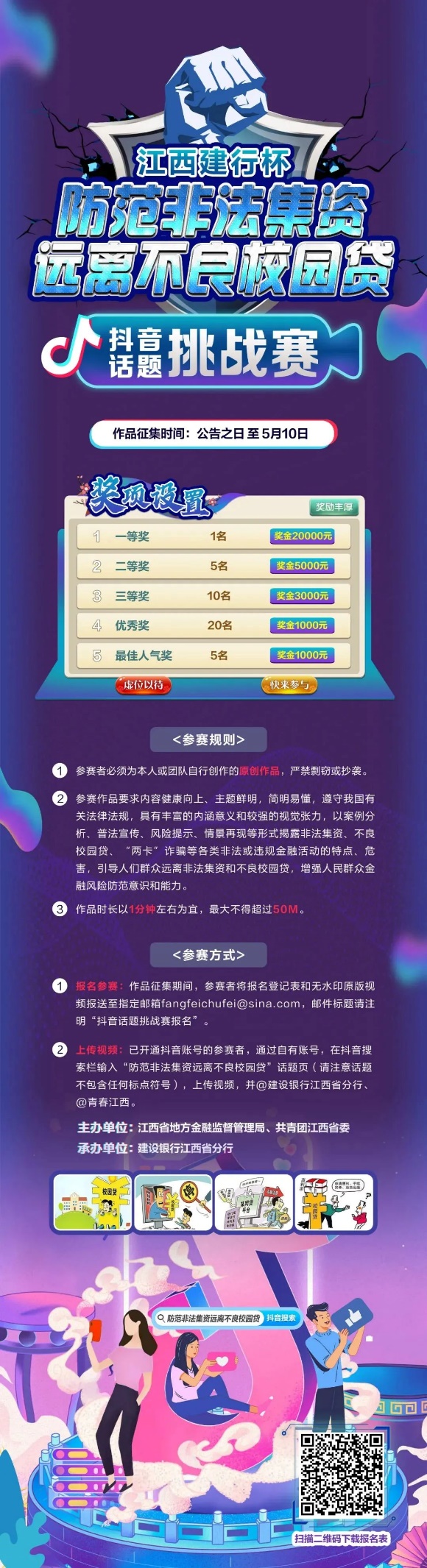 为贯彻落实《防范和处置非法集资条例》,增强防范非法集资和不良校园贷宣传教育的趣味性,扩大线上传播影响力,提升社会公众对非法集资和不良校园贷的防范意识和识别能力,江西省地方金融监督管理局、共青团江西省委决定举办“江西建行杯”“防范非法集资 远离不良校园贷”抖音话题挑战赛,现将有关事项公告如下: